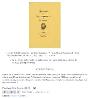 Portrait de la Renaissance, un des derniers écrits de Jean Giraudoux, devait servir d'introduction à un volume que l'École des Sciences Politiques fit imprimer en novembre 1943 pour ses élèves et anciens élèves prisonniers de guerre. Tiré à huit cent soixante exemplaires, ce volume ne fut pas mis dans le commerce. _______________________________________________________